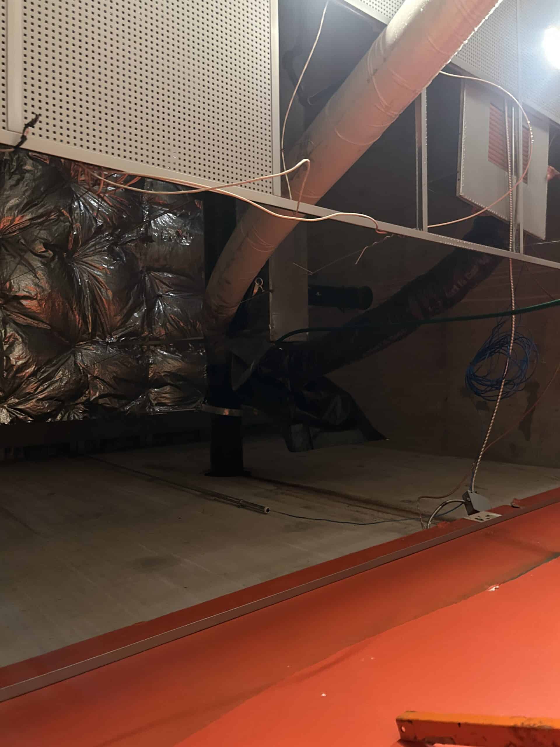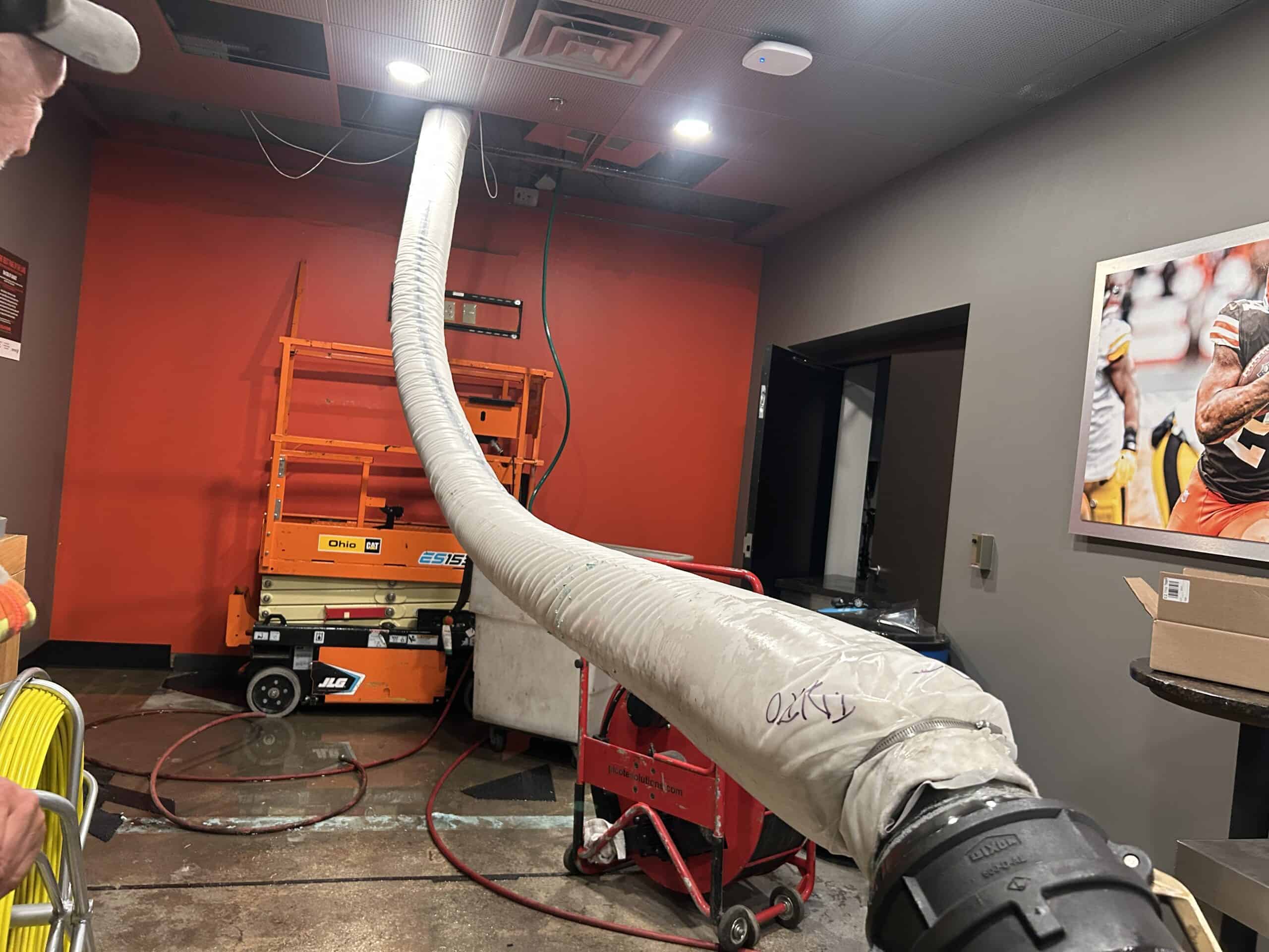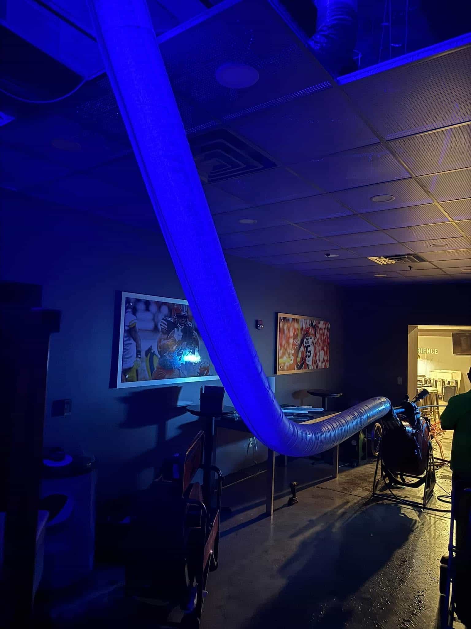 20’ of overhead leaking 8” sanitary line suspended 20’ in the air relined using Hammerhead Bluelight technology
